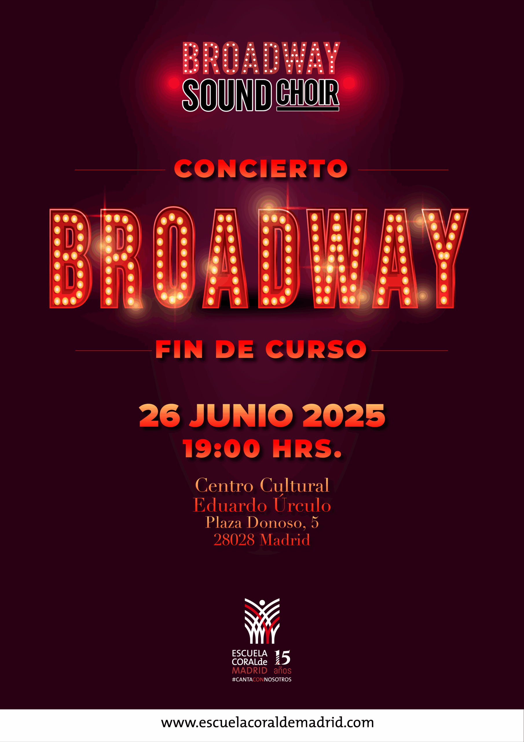 La Escuela Coral de Madrid te invita al Concierto de Fin de Curso 2025 de Broadway Sound Choir, dirigido por el maestro Manuel Pacheco.