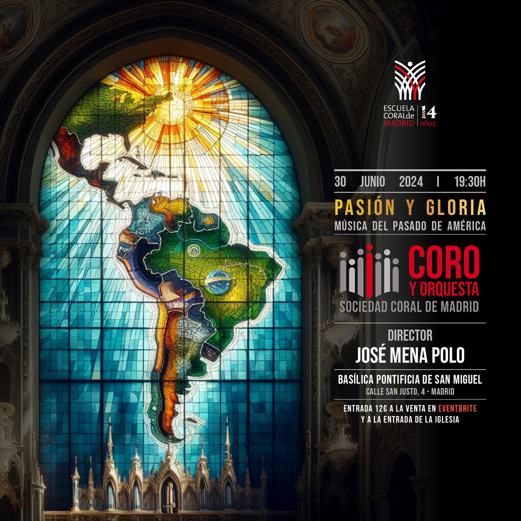 Ya están a la venta las entradas para el concierto «PASIÓN Y GLORIA. Música del pasado de América» del Coro y Orquesta de la Sociedad Coral de Madrid bajo la dirección de José Mena Polo. La cita será el domingo 30 de junio a las 19:30h en la Basílica Pontificia de San Miguel.
